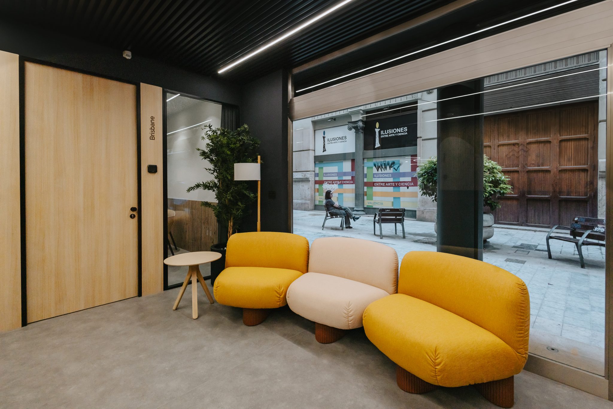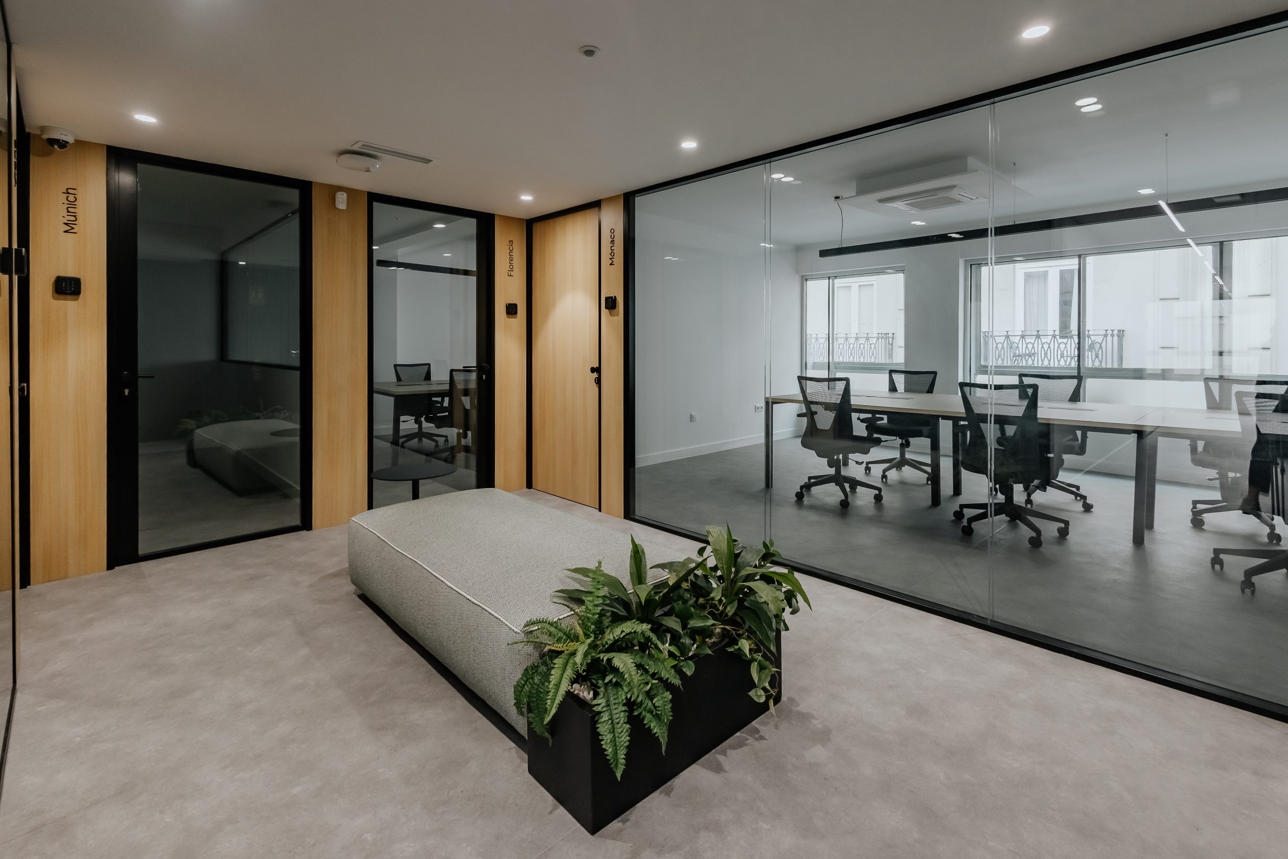 Se dota al edificio también de espacios auxiliares que se ubican cerca del acceso en planta baja como salas de reuniones, comedor, gimnasio… de esta forma el edificio puede ofrecer una carta completa de servicios para las empresas.